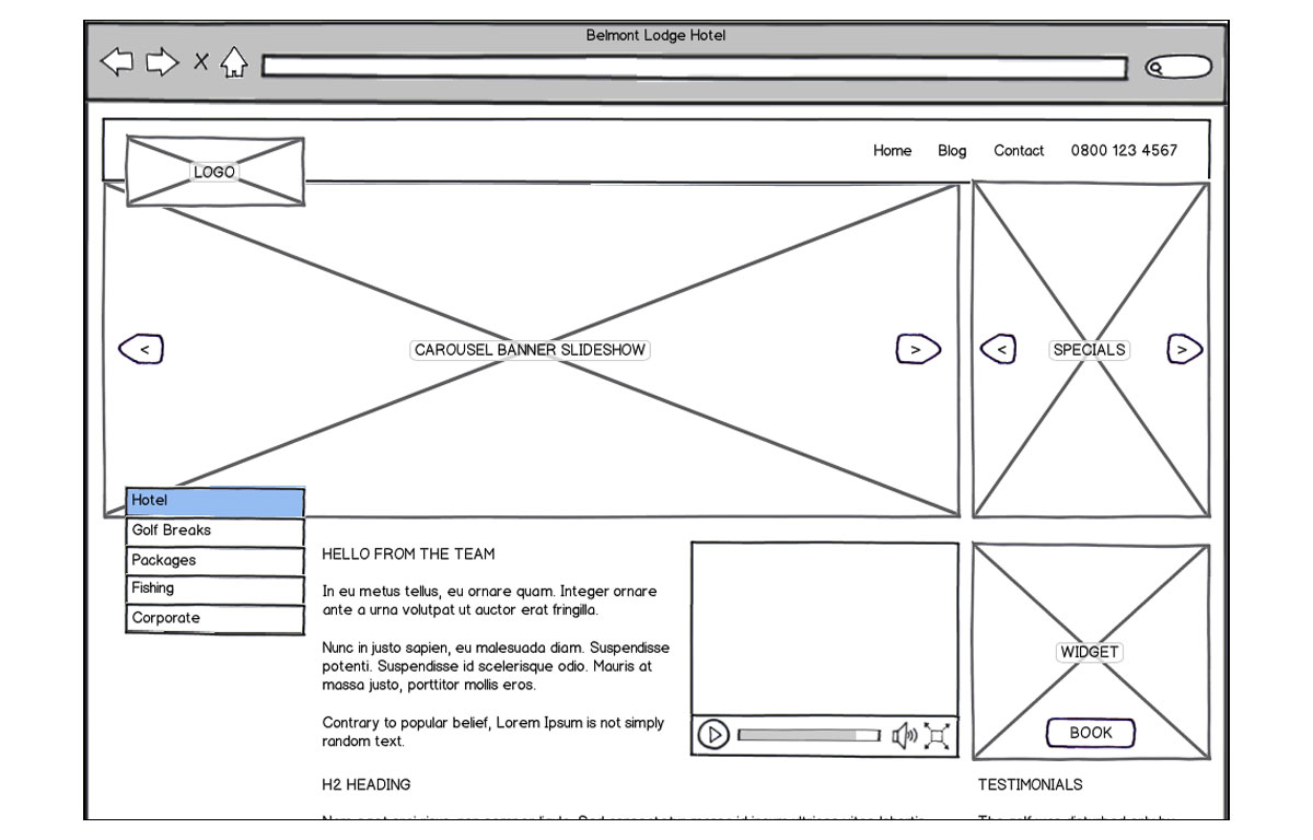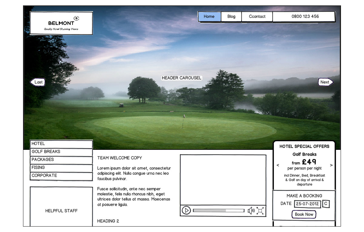 Wire-frames created for the redesign of the Belmont Lodge Hotel & Golf Course website